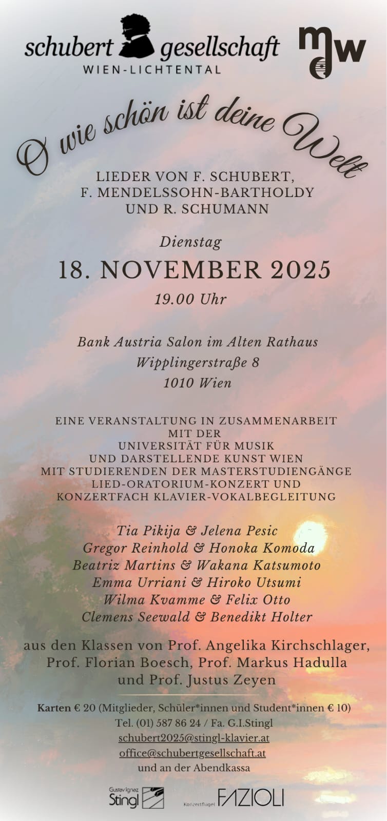 Am Vorabend zu Schuberts Todestag beglückten uns ausgezeichnete SängerInnen und PianistInnen, durchwegs Studierende der mdw aus Meisterklassen von Prof. Angelika Kirchschlager, Prof. Florian Boesch, Prof. Markus Hadulla und Prof. Justus Zeyen. Der Bank Austria Salon im Alten Rathaus bot eine edle Kulisse zur Präsentation eines anspruchsvollen Programmes. Nach dem Motto „O wie schön ist deine Welt“ brachten vor der Pause folgende Künstler/-innen wunderbare Lieder zu Gehör:
