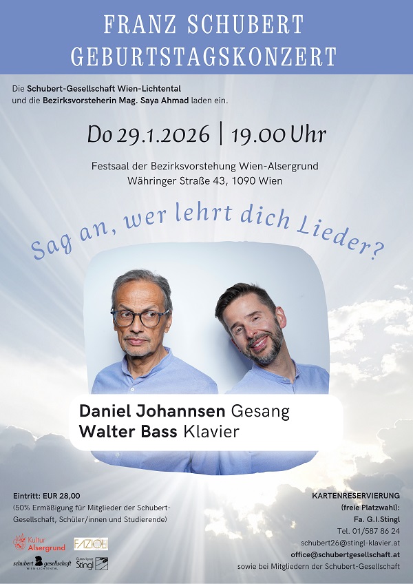 Franz Schuberts 226. Geburtstag am 31.1. wurde mit einem Festkonzert im Festsaal der Bezirksvorstehung Alsergrund unter dem Motto „Schubert im Freundeskreis“ mit Kammersänger Robert Holl (Bass) und David Lutz am Klavier freudig gefeiert.